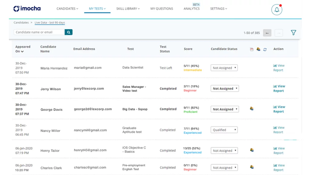 - Job-role specific pre-configured/ tagged skills assessment from iMocha will be available to the candidate to attempt. Within an hour, the candidate will receive an email with a link to complete the assessment.