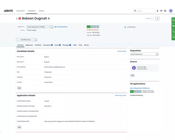 - Add a Jobvite workflow step to initiate Yardstik screening or verification packages for candidates. You’ll be able to choose a Yardstik package in the requisition tab.