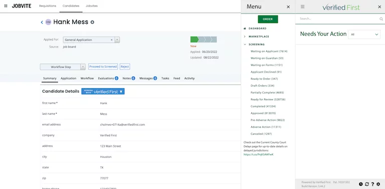 Verified First integrates with Jobvite via browser extension, streamlining your hiring and onboarding process from start to finish. With this one-click integration, users can easily order, review, and manage background screening without ever having to leave Jobvite’s platform. Candidate information from Jobvite is all passed through to the Verified First extension, reducing duplicate data entry and mitigating risk for compliance errors.