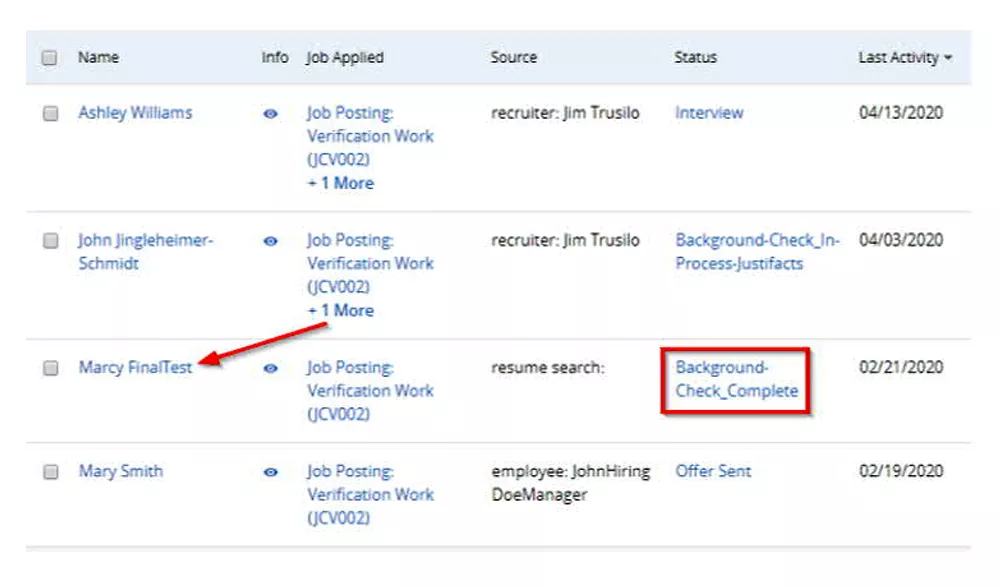 - Workflowstate options which provide the ability to submit a candidate for background check, indicate once the process has been started, and optionally to show when background check is completed.