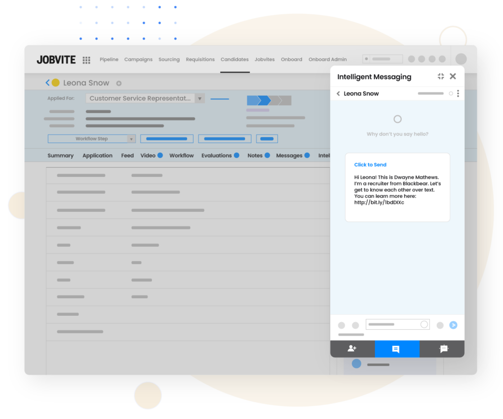 Send pre-screen forms by text and route candidates automatically based on their responses. Jobvite text bots automate screening to find qualified talent even when recruiters are not on the clock. Improve application conversion rates with text-to-apply functionality.