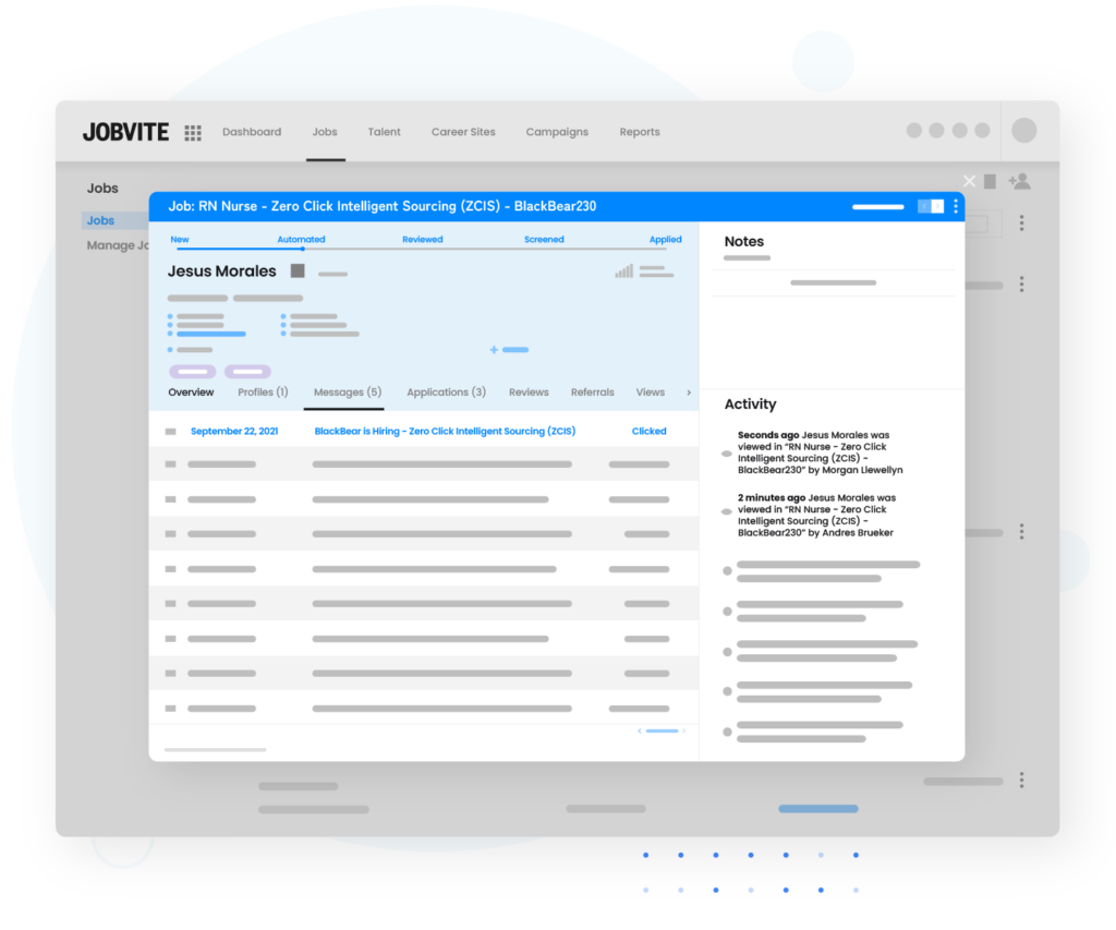 Streamlined talent acquisition requires consumer-grade experiences for candidates. Jobvite’s Intelligent Messaging makes it easy to reach candidates where they are through text messaging or career site chatbots. Communicate with job seekers by automating, organizing, sharing, and tracking text conversations. And easily enhance experiences by promoting instant, real-time career site interaction through chatbots.