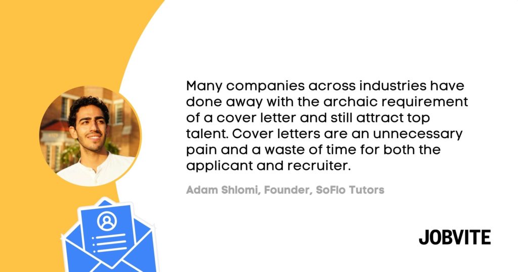 Many companies across industries have done away with the archaic requirement of a cover letter and still attract top talent. Cover letters are an unnecessary pain and a waste of time for both the applicant and recruiter. Instead, we focus on initially screening through resumes, then exploring questions of motivation, thought process — things originally described in the cover letter — during interviews.