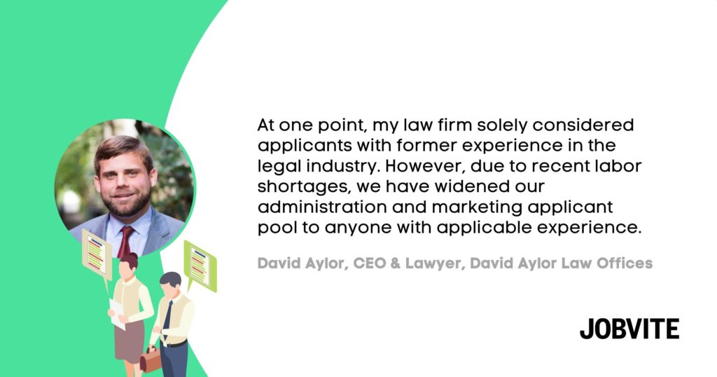 At one point, my law firm solely considered applicants with former experience in the legal industry. However, due to recent labor shortages, we have widened our administration and marketing applicant pool to anyone with applicable experience. They do not need to have experience specifically working for a law firm, though that is preferred, and we are willing to interview candidates who can apply previous professional knowledge to our open positions.