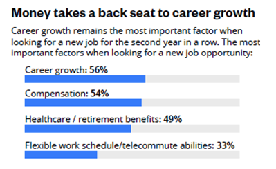 Jobvite’s 2020 Job Seeker Nation Survey found that career growth is the most critical factor (56%) when looking for a new job. Compensation is also an important consideration (54%), followed by benefits (49%) and flexible schedules (33%).