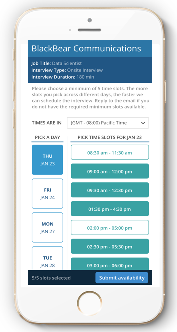 “The Smart Self-Scheduling feature has allowed me to seamlessly schedule with candidates without the need for back and forth calls or emails. I simply pick a few slots and when the candidate submits their availability, it gets automatically scheduled with detailed calendar invites. It’s easy for me to have the resume and candidate details all in one place.”
